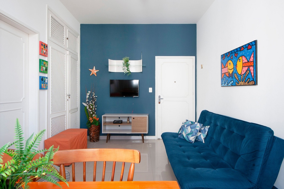 🌴 Beachfront apartment in Guarujá! 📍 Prime location, 🛏️ 2 bedrooms: -1 with a double bed, and one with a bunk bed. 💨 Fans in the living room and bedrooms. WiFi . 🍽️ Kitchen equipped with utensils 🏖️ Beach service included 🍽️ Exclusive restaurant in the building (high season) 🚶♂️ No street crossing, the building is on the sand! 🛍️ Nearby there are: • Market, bakery, restaurants, pharmacy, Guarujá shopping mall 400 m away, there are cinemas 📌 Accommodates up to 4 people.
