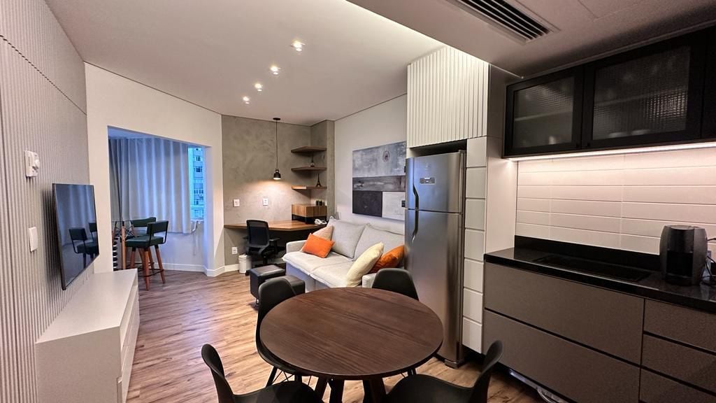 Apto no melhor Flat de Pitangueiras / Guarujá, sala com TV 50' com BTV multicanais e 2 quartos (1 suíte) tudo com ar condicionado + TV na suíte, WiFi, 1 banheiro social, tudo super bem cuidado e limpo, 1 quadra da praia com serviço de praia, arrumação diária, 2 vagas garagem com manobrista, estrutura completa com piscina aquecida com teto retrátil, sauna seca e úmida, academia, brinquedoteca, salão de jogos, 17o. andar com vista para o mar da varanda, alto padrão. Localização 5 estrelas !!