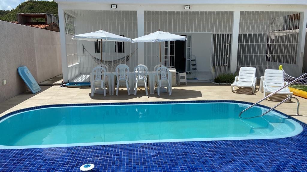 Casa localizada em Praia Azul-Pitimbu. A residência fica a 1 minuto da Praia (a pé). São 6 quartos (todos com ar-condicionado), sendo 4 suítes, havendo ainda mais 2 banheiros sociais, sala para dois ambientes e acesso a Wi-fi. A casa é muito ampla e confortável, possui um imenso terraço com espaço para várias redes, jardim, piscina e quiosque com área para churrasco. A localização é excelente, a vizinhança é tranquila e fica próximo a toda a estrutura da cidade.