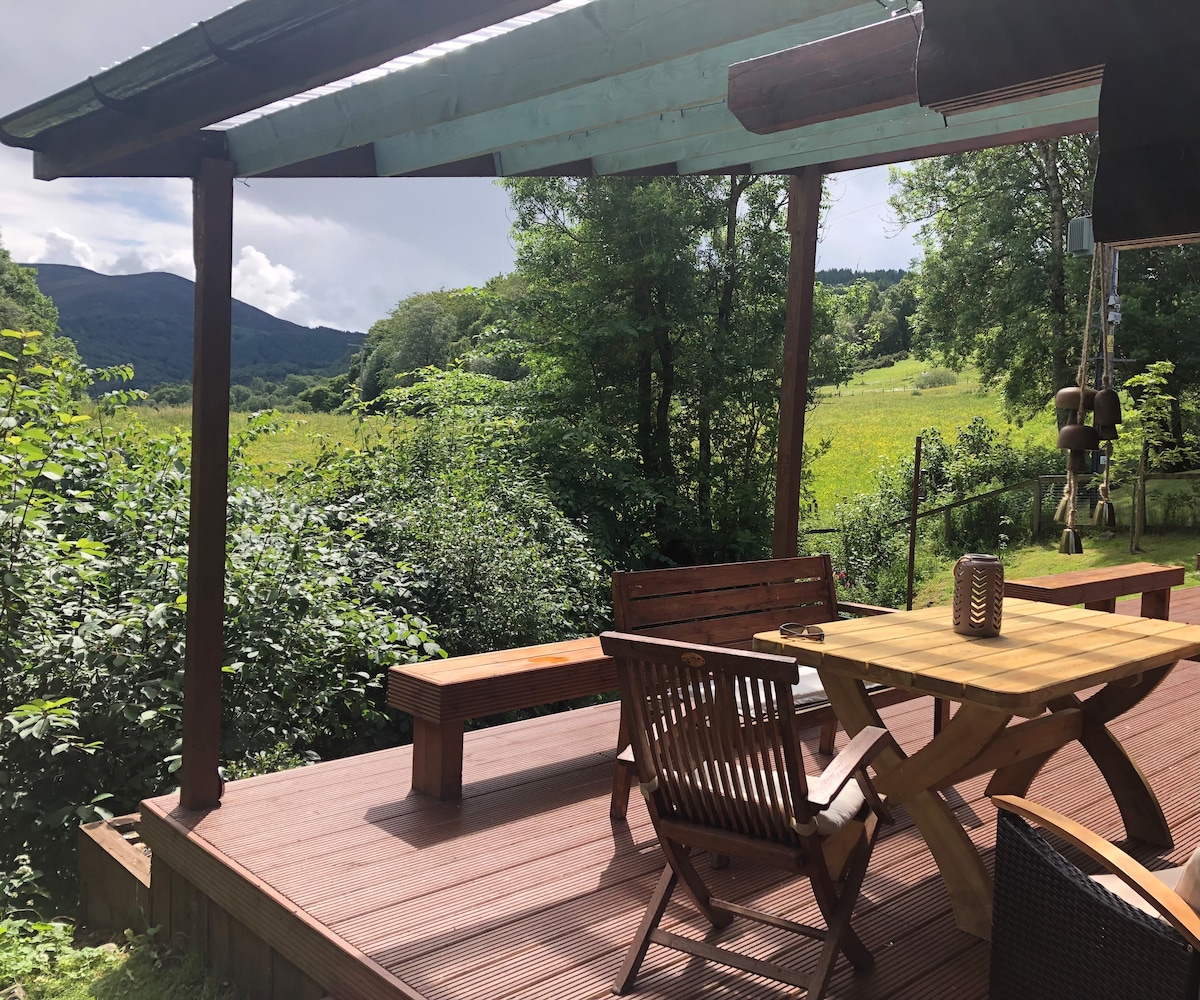 Wee Blue Dream is a simple, comfortable small cabin with amazing views of the Black Castle and Ben Vrackie, Pitlochry, Scotland. A great escape for 1-3 people, especially for outdoor activities or simply relaxing at the fire pit with a glass of red wine. Lucy, our akita collie cross, welcomes all friendly dogs FOC. There is a wood-burning stove, double futon sofa/bed and day bed - all bedding provided, and a small kitchen area. There is a private shower room 10 metres away, with dishwasher.