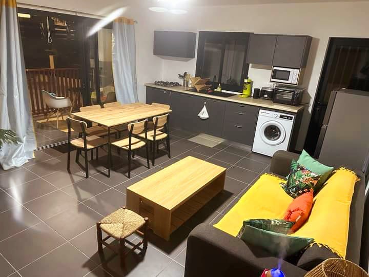 Ce T2 à Piton Saint-Leu offre une cuisine équipée ouverte sur un salon lumineux et un petit extérieur. À l'étage, vous trouverez une salle de bains moderne refaite à neuf en béton ciré, équipée d'une douche à l'italienne et d’un lave-linge. La chambre dispose d’un lit double, avec des options d'appoint. La résidence est sécurisée et offre une grande piscine et une salle de sport. À seulement 10 min de la plage de St-Leu en voiture, à 25 min de St-Gilles et à 26 min de St-Pierre