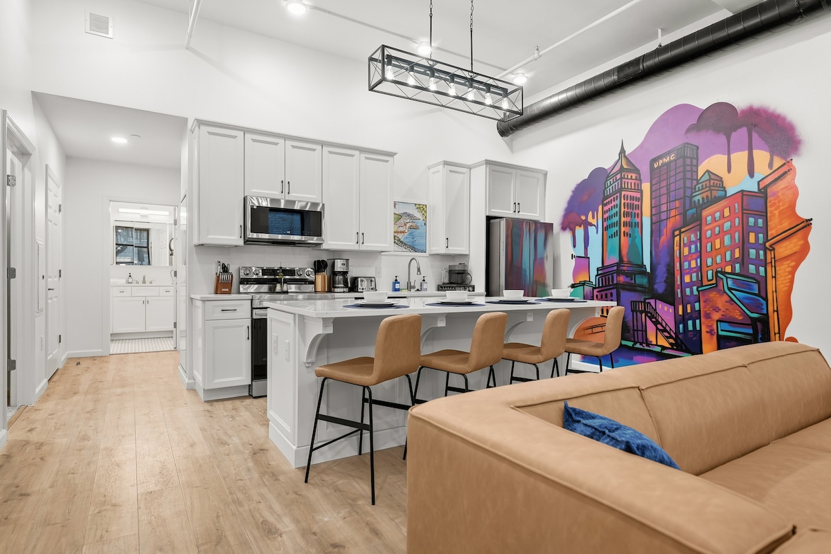 This 1 Bedroom Apartment is ideal if you need a safe, clean, stylish place to stay in the city. It has a huge bedroom with queen bed, large living room with Italian leather sectional, giant fully functional kitchen, separate nook with extra sofa bed and a full bathroom. It works well for couples or friends visiting Pittsburgh, affording you a safe, clean and comfy place to recharge for the night (not suitable for kids under 10).