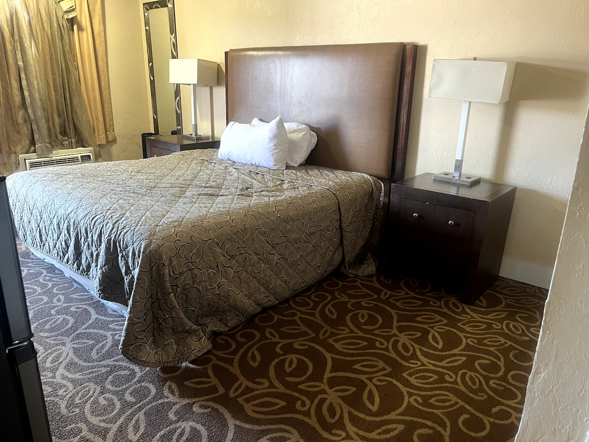 The full-bed room is a private room for up to two people with a private, assigned, detached bathroom in the Traveler's Rest independent hotel. It is furnished with a full, extra-long bed and a mini-fridge. The building is centrally heated and cooled. All guests have access to complimentary WiFi. Towels and linens are included. Shampoo, conditioner, and body wash in an eco-friendly self-service setup. No outside towels or linens are permitted.