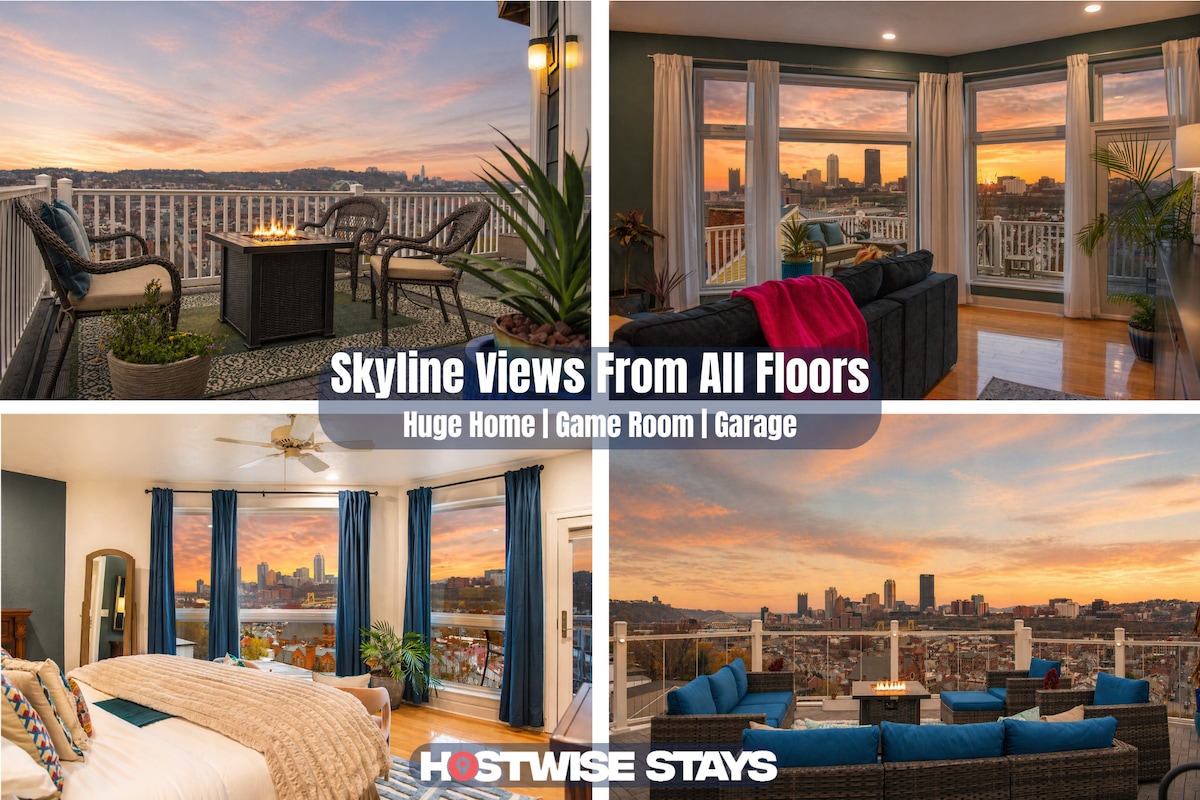 Soak up jaw-dropping skyline views from four private outdoor spaces—including a full rooftop deck with grill, fire pit, bar seating & games. Perfect for families and groups, this 5-floor South Side Slopes retreat features a game-packed basement (ping pong, pool, darts), luxe primary suite (with city views!), spacious living areas, garage parking, and even a massage-chair “man cave.” The ultimate Pittsburgh stay for gathering, relaxing & making memories.