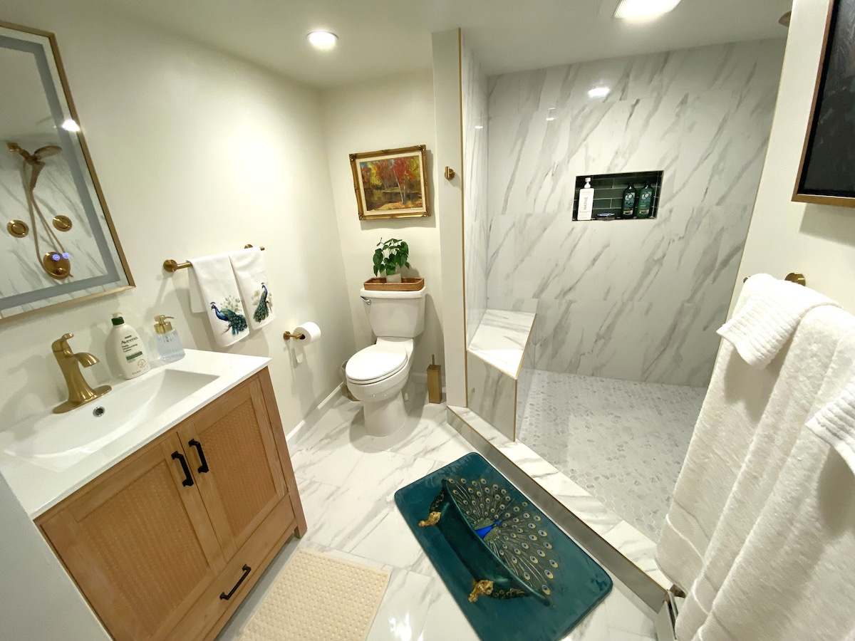 Private suite with its own entrance and laundry — perfect for short stays in Pittsburgh. The highlight is a new spa-inspired bathroom featuring a walk-in shower with oversized rain head, handheld, and dual body jets—finished with elegant brushed gold fixtures for a true luxury feel. Enjoy a quiet and safe neighborhood just 15 minutes from downtown. Includes private parking for 2 vehicles, plus essentials for light meals (mini fridge, microwave, and coffee station).