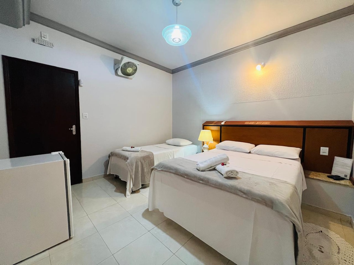 As suítes dispõem de 1 cama de casal e 1 bicama, TV tela plana, frigobar, mesa de apoio com 2 cadeiras, arara cabideiro para roupas, malas e sapatos, ar condicionado, banheiro privativo e Wi-Fi. Suítes com banheiro privativo e ar condicionado.
