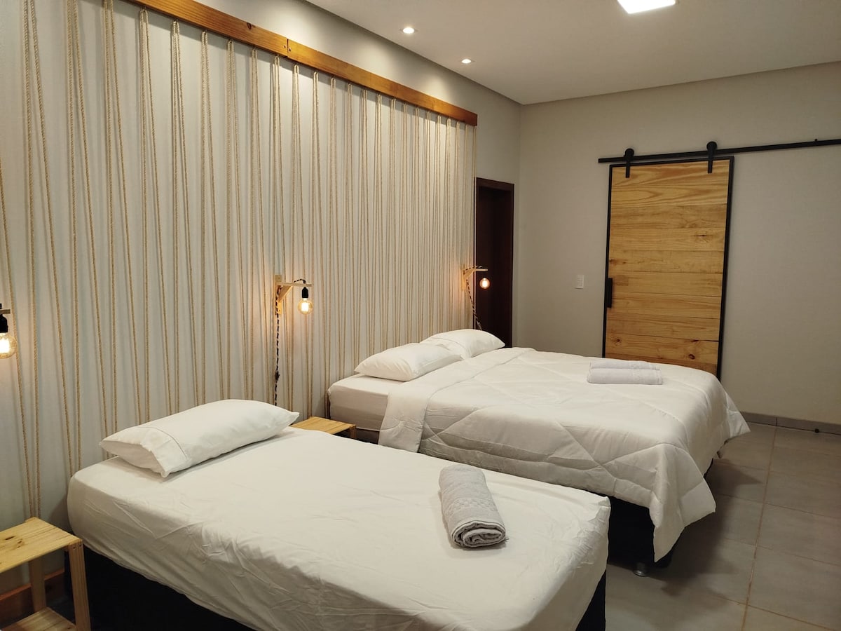 O quarto é equipado com uma confortável cama de casal e uma cama de solteiro, oferecendo espaço suficiente para relaxar após um dia repleto de aventuras. Além disso, você encontrará um ventilador para garantir noites tranquilas de sono. O quarto inclui roupas de cama limpas e toalhas de banho para sua conveniência.