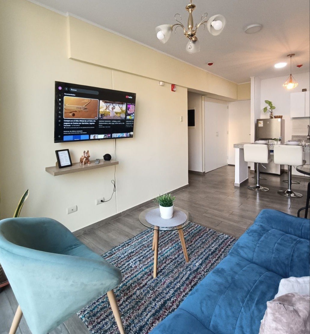 Moderno departamento full amoblado ideal para largas estancias. Smart TV, wi-fi rápido, aire acondicionado, cocina equipada, lavadora, cama Queen, agua caliente y balcón a la calle. Recepción 24 horas, Piscina, ascensor. El alojamiento. Tu espacio ideal para descansar y disfrutar al máximo ya sea que viajes por trabajo, turismo o una estadia prolongada,aquí encontrarás todo lo que necesitas.