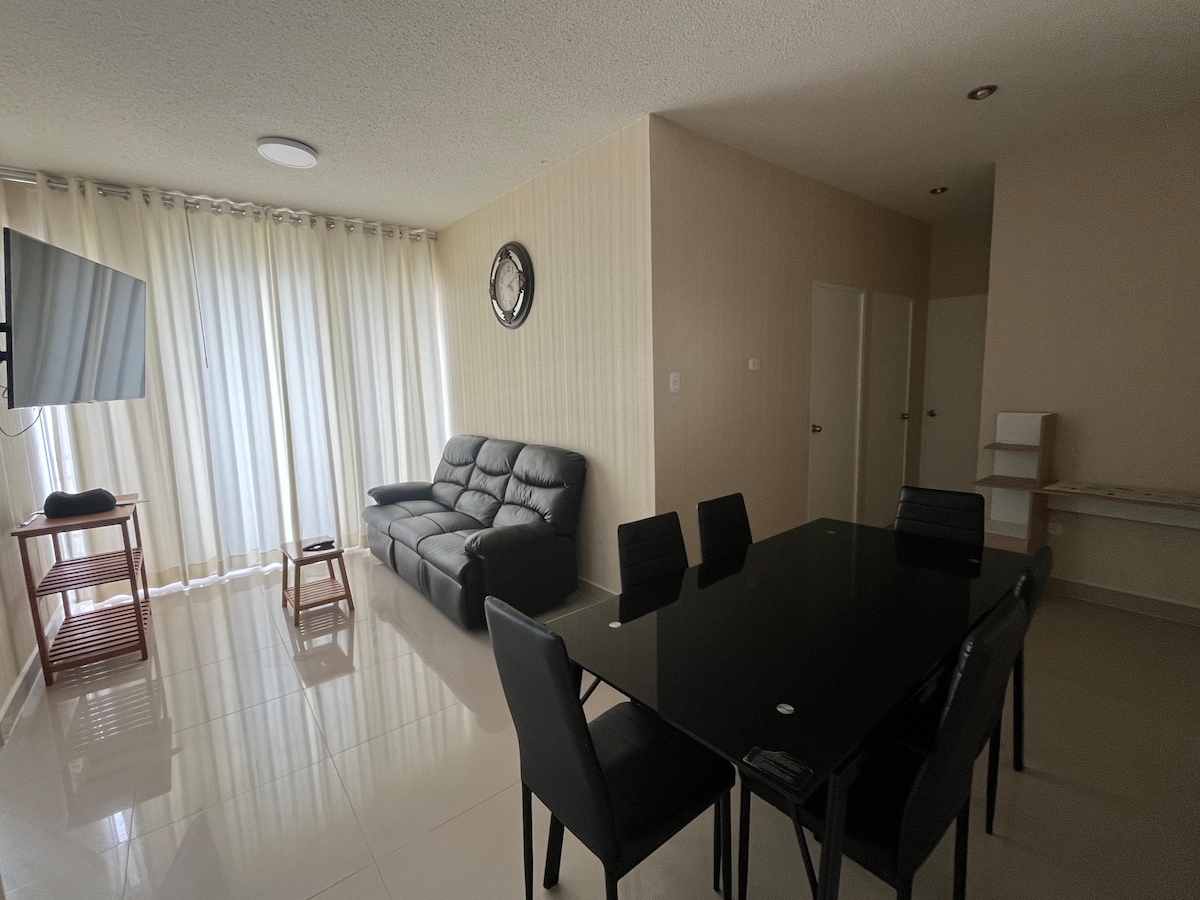 Relájate con toda la familia en tu próximo viaje a Piura. El departamento se encuentra en el 6to piso y tiene lo siguiente: - Habitación Principal con Cama King, TV y Aire Acondicionado y Baño completo. - Dos Habitiones adic con Cama de Dos Plazas. - Baño de visita - Escritorio y zona de lectura con vista a la piscina. - Wifi con Netflix - Piscina y Gym con previa reserva. (1 Hora al día por Dpto) - Cocina completa - Lavaseca - Terma SOLO LA HABITACIÓN PRINCIPAL TIENE AIRE ACONDICIONADO