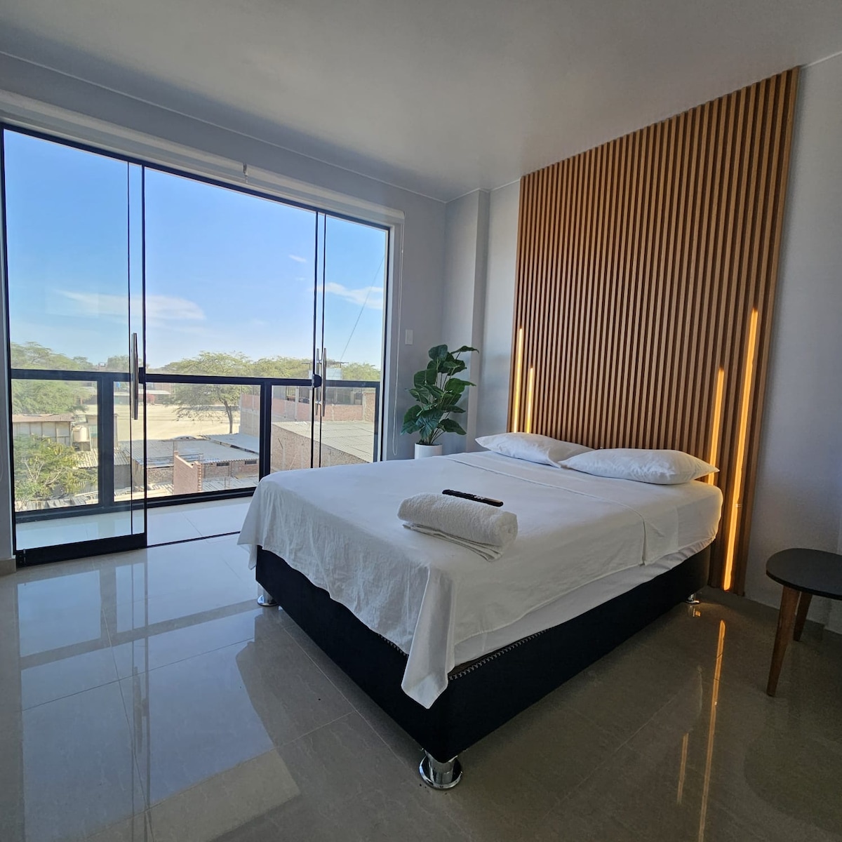 Elegante Habitación Estilo Hotelero en el Corazón de Piura Disfruta de una habitación de lujo con decoración elegante, a solo 2 cuadras del centro histórico y 7 minutos del aeropuerto . Perfecta para quienes buscan confort, privacidad y ubicación inmejorable. Incluye baño privado, TV con cable, Wi-Fi rápido y acceso independiente. ¡Tu experiencia en Piura comienza aquí!