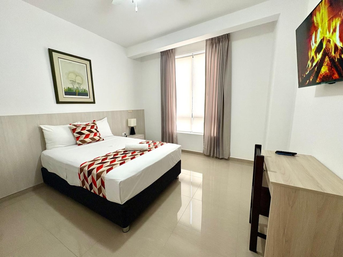 Moderna y luminosa habitación con cama matrimonial, baño privado, TV, escritorio y balcón con vista exterior. Decoración minimalista, piso tipo madera y baño elegante, ideal para una estadía cómoda y relajante.