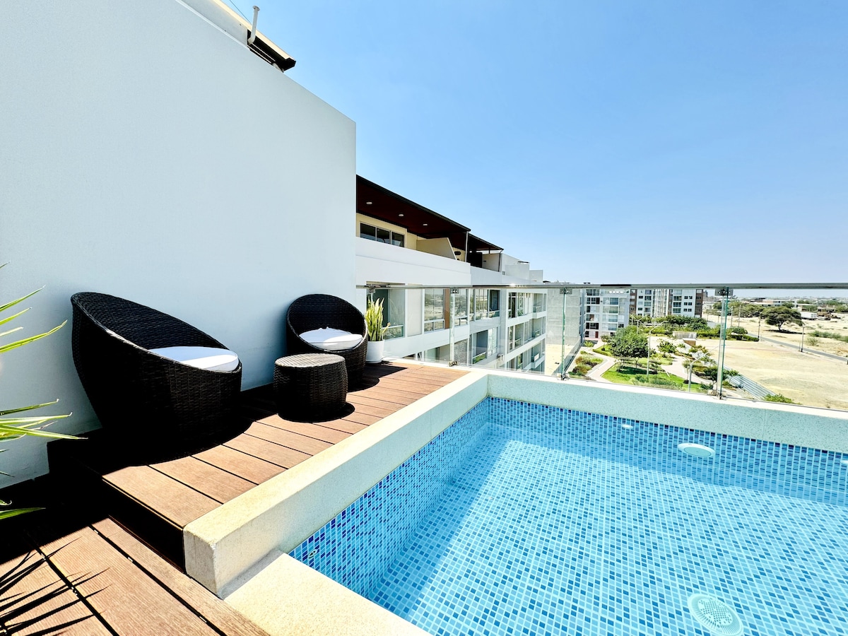 Suite Apart Piura, esta ubicado dentro de unos de los condominios mas exclusivos de la ciudad de Piura- Condominio Garden 360, ubicado al costado de la universidad UPAO. El departamento, cuenta con areas comunes como pisicina, parque con areas verdes y recreativas para niños. El departamento esta totalmente equipado y amblado para una estancia placentera, cuenta con 2 smart tv con acceso a Netflix, prime, 145 canales de cable, aire acondicionado, therma.