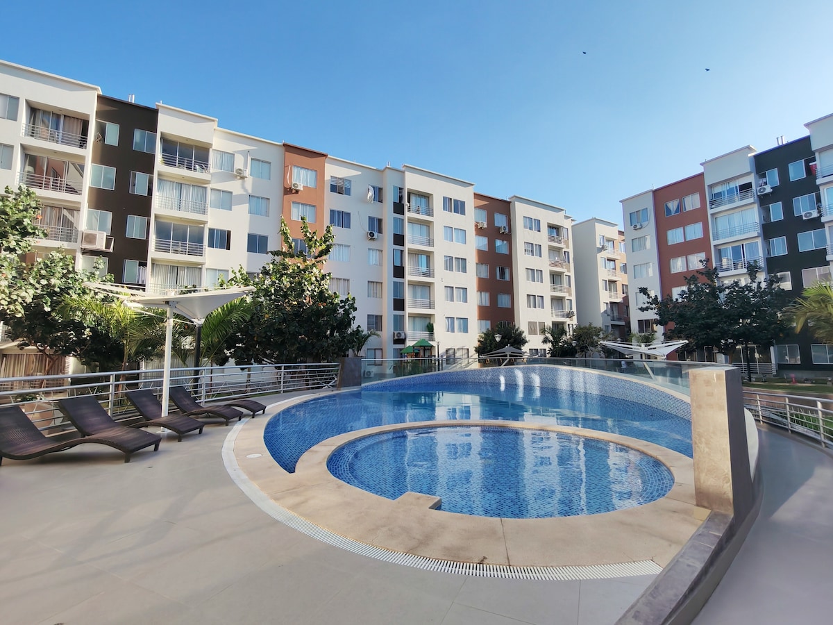 Departamento ideal para estancias cortas o largas, con capacidad para 5 personas. Cuenta con 3 habitaciones, cocina totalmente equipada, sala comedor y sala de estar. Habitación principal con baño privado y hermosa vista a la piscina. Incluye Wi-Fi. Los huéspedes tienen acceso a áreas comunes del condominio: piscina, gimnasio, áreas verdes y juegos para niños. Perfecto para familias o grupos de amigos.