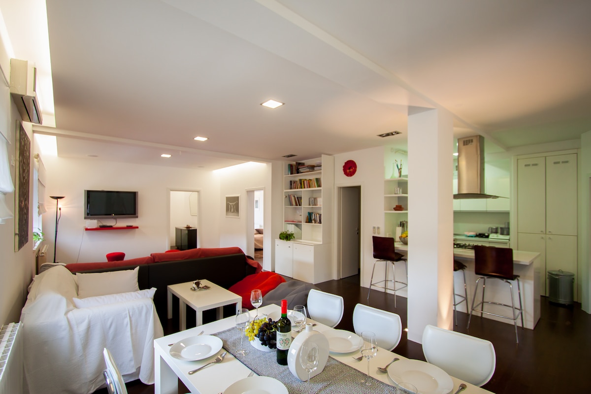 The apartment (50m2 + 25m2 terrace with an amazing view) is located in the city core, 30 m away from the Coliseum, in the close vicinity of all city sights. Furnished in a modern manner, air-conditioned, free wifi internet. Free reserved parking place is in closed building courtyard.