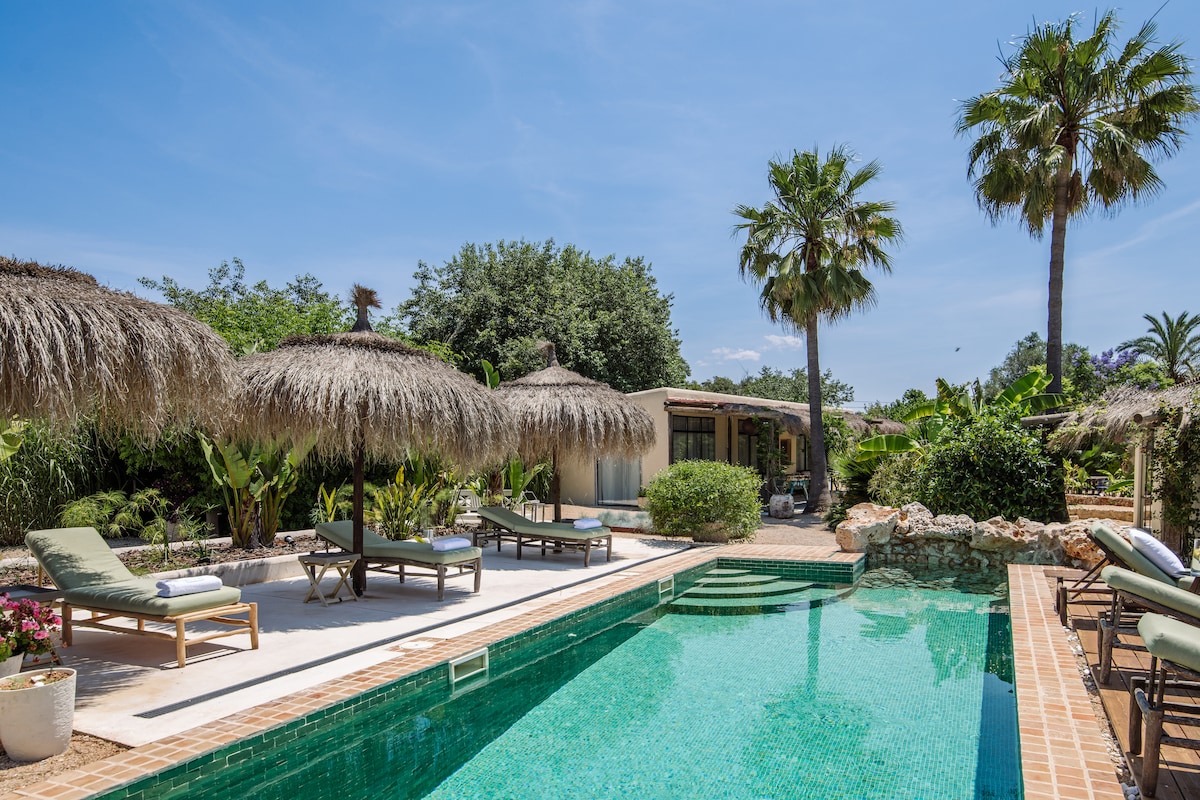 The lower terrace is cloistered within gorgeous walls and lush ivy, yielding to a vast vista of mountains and Mediterranean sky. Dip into the gem-toned water and bask in the sunlight on lovely lounge chairs. Fire up the barbecue and relish meals in the gentle breeze. Sip Herbs de Mallorca (a traditional liqueur) or bottles of Spanish wine, enjoying the sunset and starry night sky.