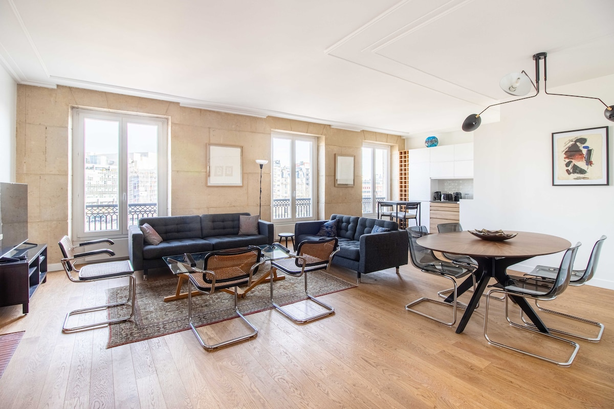 Découvrez l'enchantement de Paris dans le confort de votre propre havre de paix. Niché au cœur du Marais, l'appartement offre des vues panoramiques à couper le souffle sur la Seine, la Tour Eiffel et la Notre-Dame, une scène toute droit sortie d'une carte postale. Enveloppé dans l'élégance douillette de l'appartement, c'est le point de vue ultime pour observer Paris dans toute sa splendeur. Vous êtes aux premières loges de la magie de Paris.