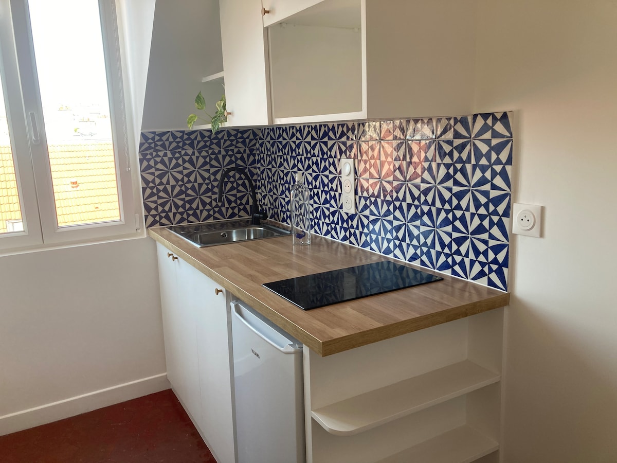 Beautiful 484 sq. ft. apartment nestled in the heart of Paris. Superbly decorated, bright, comfortable and extremely well located in the Bastille area. You will benefit from a convivial living room with dynamic colors, as well as a very nice, completely equipped, American kitchen! The bedroom is smartly separated by a library and it can be isolated with 2 white curtains. There is also a bathroom with vintage colors and a separate powder room.