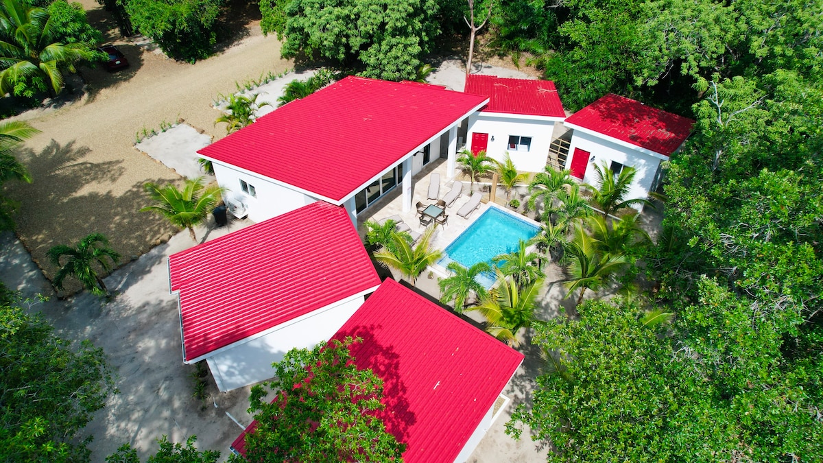 You have the 2nd floor of a large 3 story home at the north end of Placencia Village. 2 Bedrooms, 2 full baths. Air conditioning throughout. Full sized, well stocked kitchen. Ample indoor & outdoor space. Pool & sun deck just steps from your back deck . Ideal location; one minute walk to the lagoon, 3 minutes to the famous Sidewalk and the Sea. Tour operator with golf cart rentals is next door. Coffee shop & grocery store less than a two minute walk away. Free bikes and no airbnb service fee!
