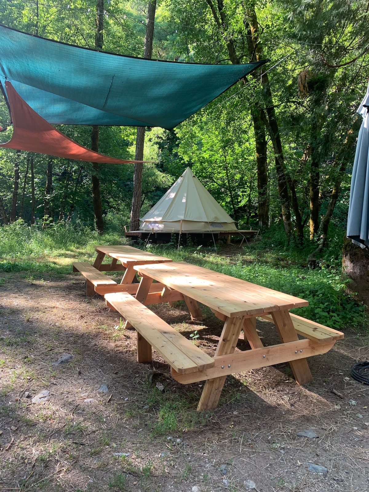 Dipper Camp is a large private, creek-side campground along Deer Creek. Retreat and relax at this rustic, unplugged site designed for groups of 6 to 10. The camp includes three spacious safari-style bedroom tents with comfortable beds, a camp kitchen with hot water, picnic tables, fire ring, composting toilets, outdoor hot-water shower & clawfoot bathtub. On a dirt road, surrounded by public land, you feel as if you are “out there” but you are less than 1.5 miles to lovely downtown Nevada City.