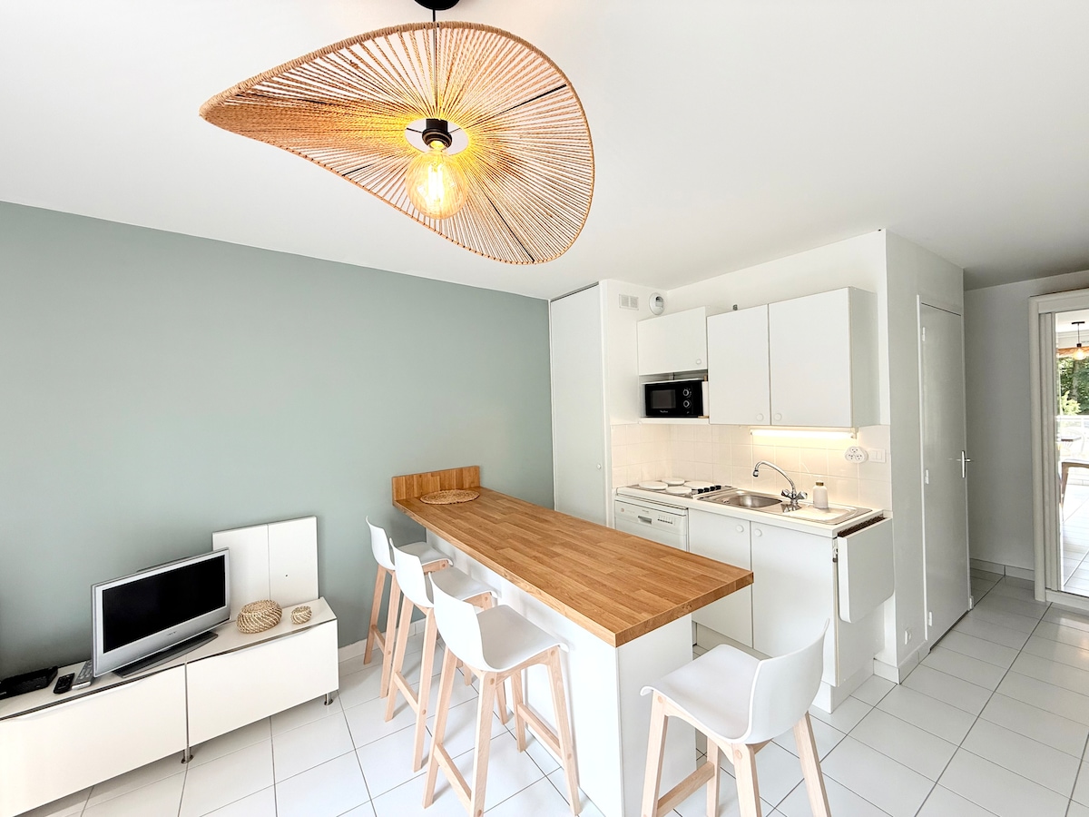 Studio entièrement remis à neuf dans une ambiance exotique, au sein d'un immeuble sécurisé avec ascenseur. Parking privatif et balcon de bonne dimension. Très tranquille. A 50 mètres de la grande plage A 50 mètres de l'Aquabaule (très belle piscine avec bassins intérieurs, bassin nordique en extérieur, Spa à l'étage) A 5 minutes à pied des commerces Cuisine et salle de bains tout confort. Parfait pour un couple (jusque 3-4 pers.) : 1 vrai lit et un canapé convertible.