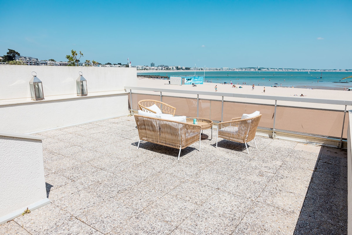 Nous proposons à la location cet appartement refait à neuf cette année et situé sur la plage du Nau au Pouliguen. Il fait 75 m2 avec 76 m2 de terrasse idéalement situé avec un accès plage direct depuis le RDC de l'immeuble. Tout peut se faire à pied: marché, plage, port, commerce. Immeuble avec ascenseur , place de parking fermé Couchage: 2 chambres fermées + 1 lit escamotable double dans le salon. 1 chambre avec 1 lit double et une autre avec 2 lits superposés soit 8 couchages en tout!