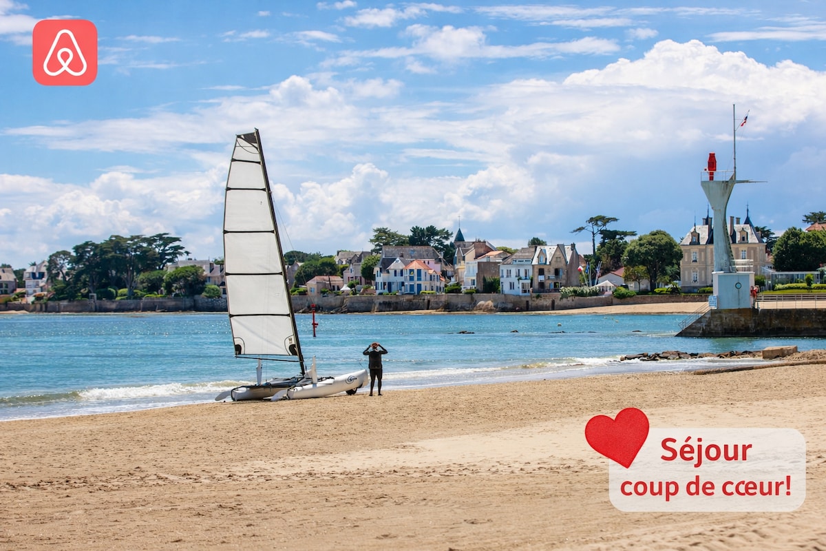 Appartement de standing 40m2 situé à 5mn à pied de plage Benoît à La Baule. Il bénéficie d'une vue imprenable sur le port de plaisance du Pouliguen. Il se compose d'une chambre avec lit double et dressing; d'un salon avec canapé convertible 2 personnes, d’une cuisine entièrement équipée; une salle de bain avec douche, WC et machine à laver/séchante; une loggia avec coin salon et table à manger. Stationnement gratuit et facile autour du bâtiment Location d’1 canoë possible sur place,me demander