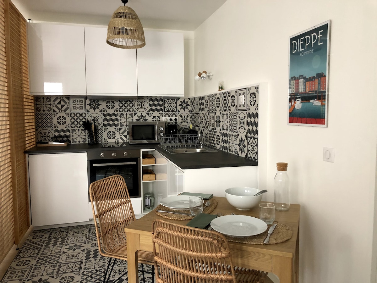 Jolie Studette de 13 m2 au cœur de Dieppe. Au calme dans une cour accessible par la rue piétonne : parfait pour le marché du samedi, le plus beau de France ! Les draps et serviettes sont fournis! Plage à 300 m Port à 250 m Penly : 15km L'organisation et les heures d'arrivée peuvent être modifiable en votre faveur selon la disponibilité, n'hésitez pas à nous demander ! L’appartement dispose de la wifi et de la TV.
