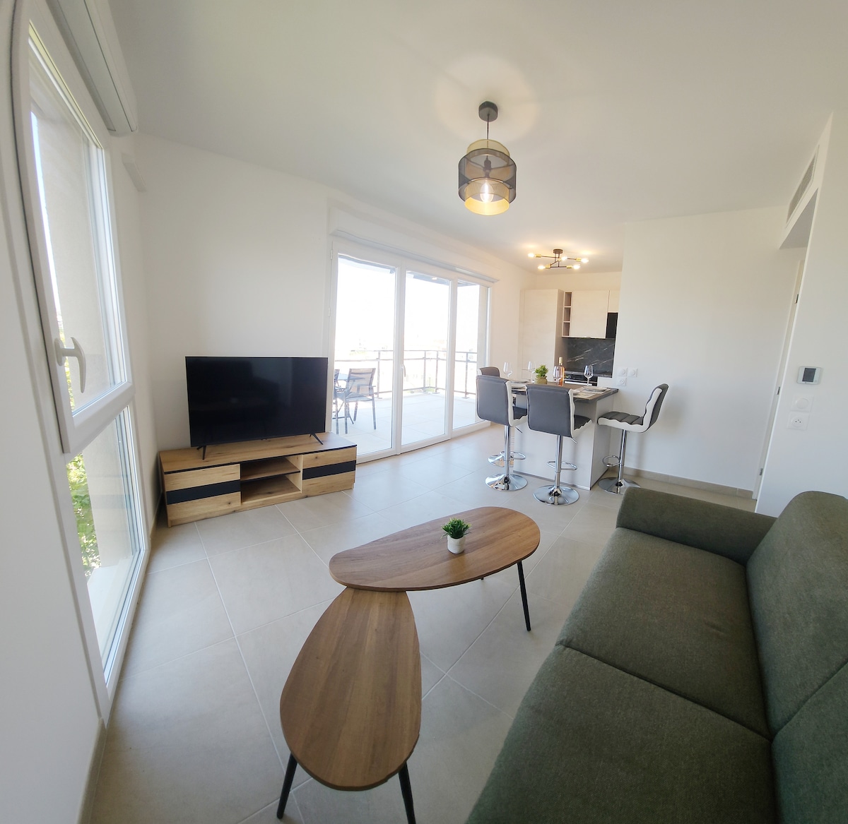 F2 avec balcon, 40 m2 PLEIN CENTRE VILLE rue calme. Neuf, très lumineux. Climatisation séjour et chambre, 1 couchages double dans la chambre + couchage canapé lit couchage quotidien , lave linge, lave vaisselle, wifi, décodeur canal + et SAT. 40 m de la plage, des commerces, restaurants, marché local et nocturne, gare SNCF, bateaux de visite. Parking sécurisé uniquement sur demande . Lit Bébé possible gratuitement sur demande
