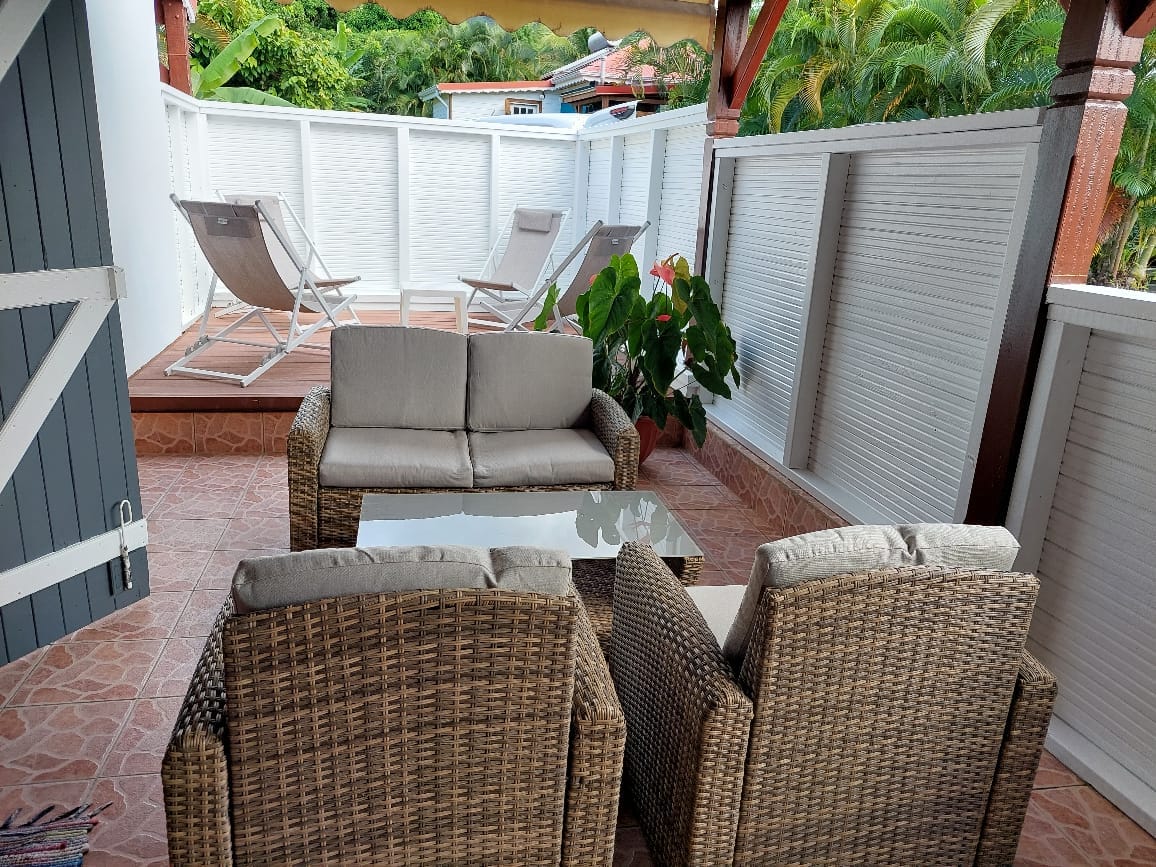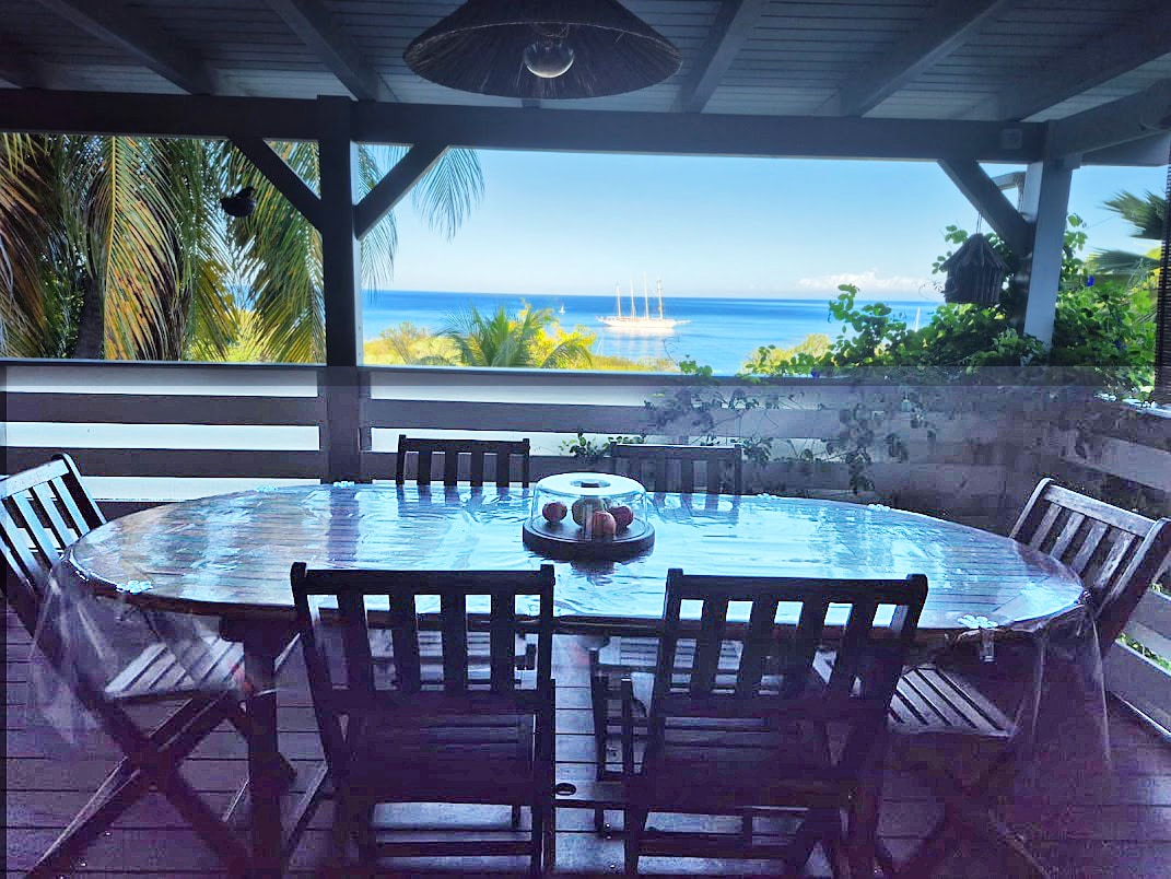 Maison , vue 180° sur mer des Caraïbes. Plage a 50 mètres. Cuisine toute équipée (plaque, micro-ondes, lave vaisselle, lave linge etc...), air conditionné dans les chambres, grande véranda de 50m2. Bar ouvert sur véranda. Deck avec solarium et barbecue. Chambres spacieuses avec rangements. 2 salles de bains, 2 WC. Salon et espace repas sur véranda. Wifi gratuit (fibre) Proximité route passante occasionnant en journée du bruit de voitures . Cet inconvénient disparaissant le soir et la nuit.