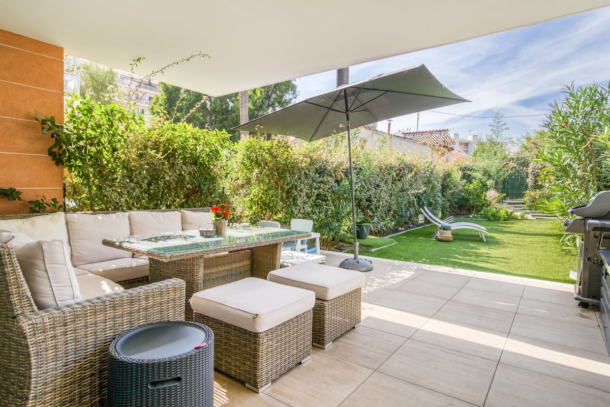 Quiet 2 bedroom appartment between Cannes and Antibes, 60 sqm with private garden (300 sqm) and communal pool located in Juans les pins. You can stay in the property relax on a sunbed in the garden or by the pool or you can walk 5 minutes to enjoy sandy beautiful beaches. You can access bakery, retaurants, supermarkets and public transport just by walking down the street. You have all the comforts such as private parking, elevator, ac, wifi, trampoline, hammac and kitchen facilities.