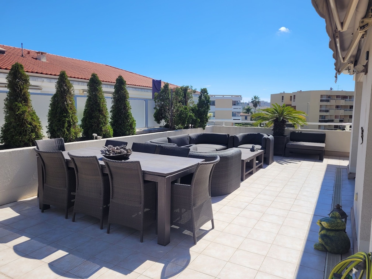 MY FLAT, of 92 square meters, IS CLOSE TO THE BEACH AND THE CITY CENTER (BOTH AT 10 MIN BY FOOT) , IN A BEAUTIFUL, HUGE ( ONE HECTARE),CLOSED AND SECURED LUXURIOUS PARK AND RESIDENCE. YOU WILL APPRECIATE THE VIEW , THE LOCATION , THE PRIVATE SWIMMING POOL , THE CALM AND THE THREE TERRACES (EAST, SOUTH, WEST) . MY FLAT IS PERFECT FOR COUPLES AND FAMILIES WITH CHILDREN. SECURED CAR PARK POSSIBLE FOR SEVERAL CARS . ALL THE FURNITURE, INCLUDING THE BEDS, ARE BRAND NEW .
