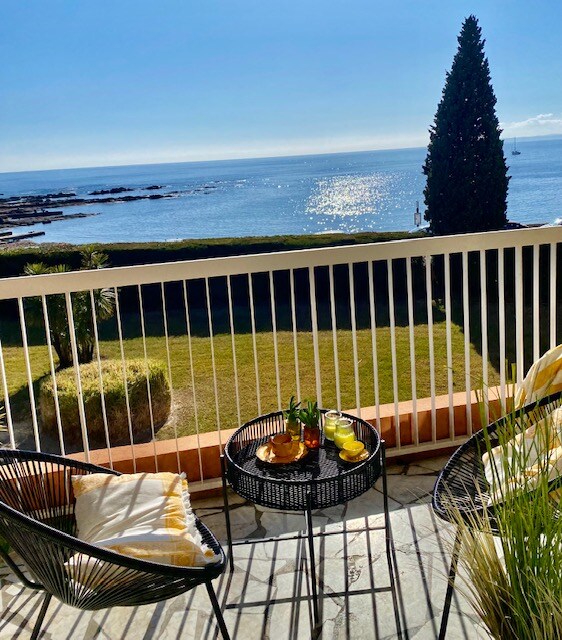 Studio pour 2 personnes ( ne convient pas à un enfant de moins de 5 ans) Double vitrage, plein sud ,face mer avec belle terrasse, au bord de la plage de la Péguière . 1351 route de la corniche-Saint Raphael. 3 ème et dernier étage avec ascenseur. Place de parking dans résidence sécurisée et garage pour 2 roues. Arrêt de bus au pied de l'immeuble ( centre ville à 2kms-Boulouris 800m). F ace au C.E.R.S (centre Européen de rééducation du sportif) CREPS site de Boulouris à proximité Golf. Esterel.