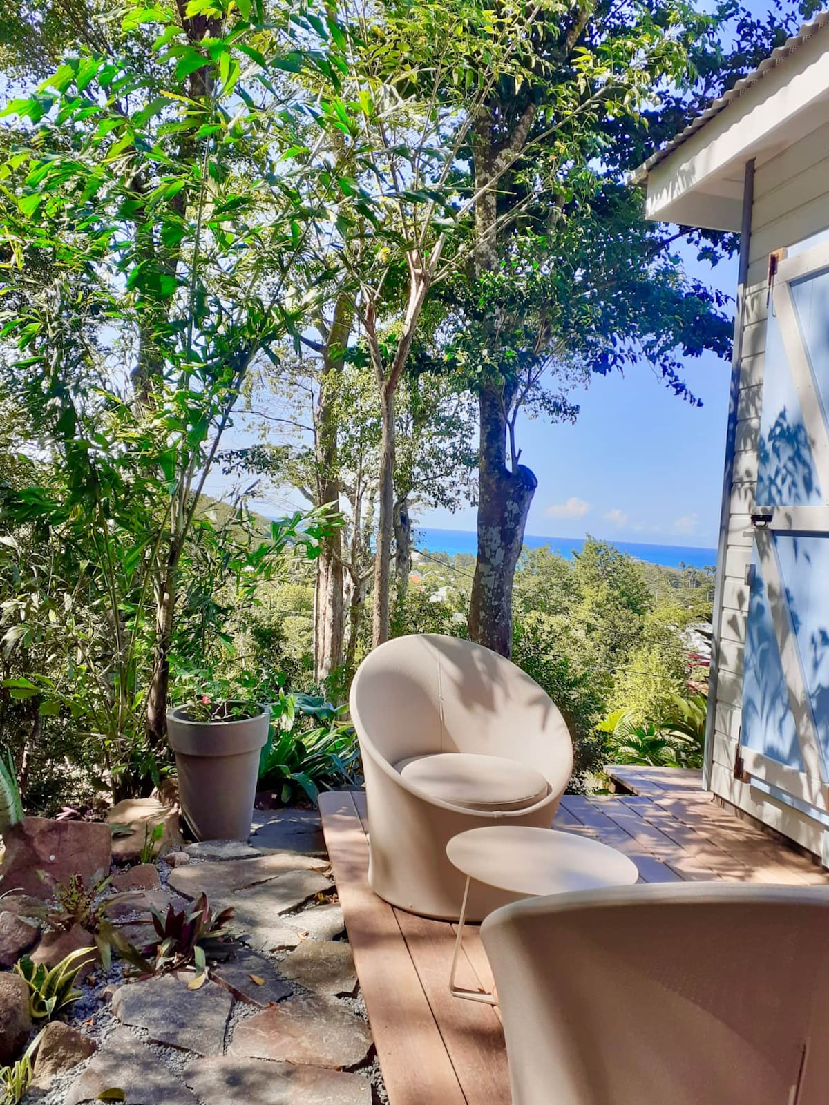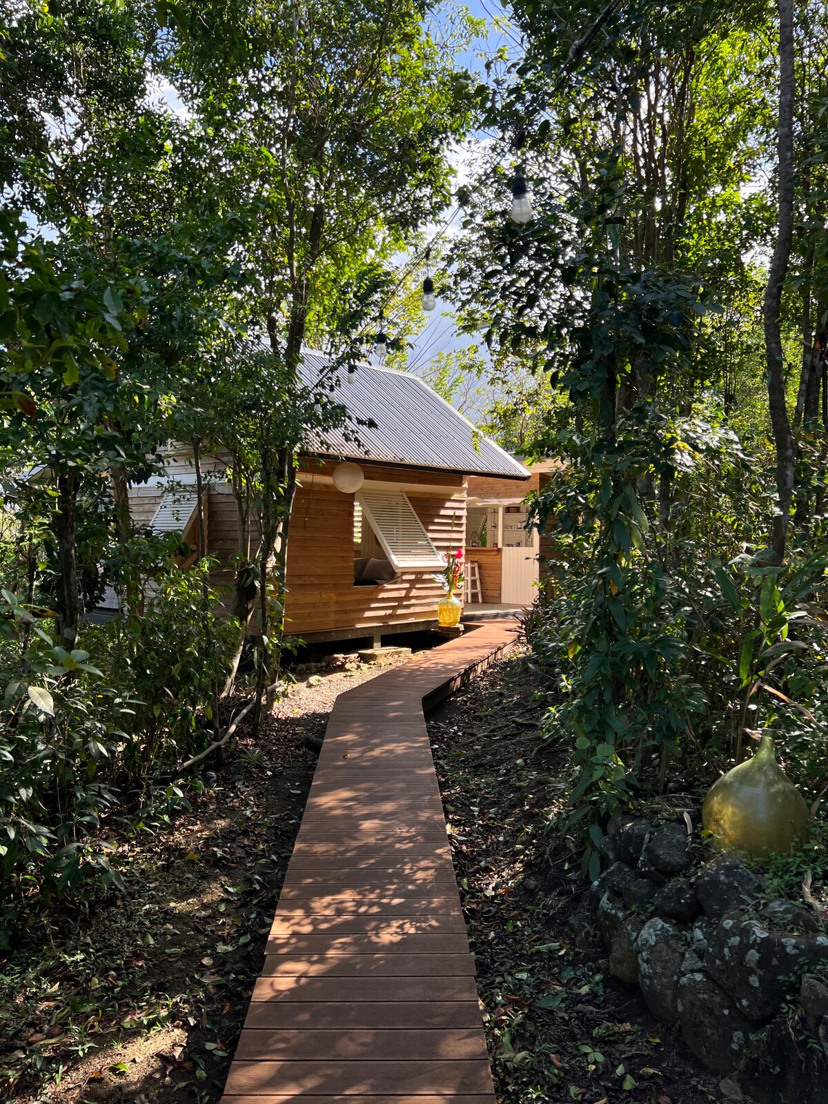 Ici vous serez chez vous. Bienvenue dans votre petit coin de paradis lové au coeur de la belle forêt tropicale de notre propriété. Avec sa terrasse sur pilotis, ce bungalow flambant neuf offre une vue exceptionelle su la baie de Grande Anse. Situé en contrebas de notre maison, un petit ensemble intimiste de 3 bungalows vous attend au calme, chaque bungalow est isolé dans sa petite bulle de verdure où vous pourrez profiter pleinement de votre jacuzzi privatif.