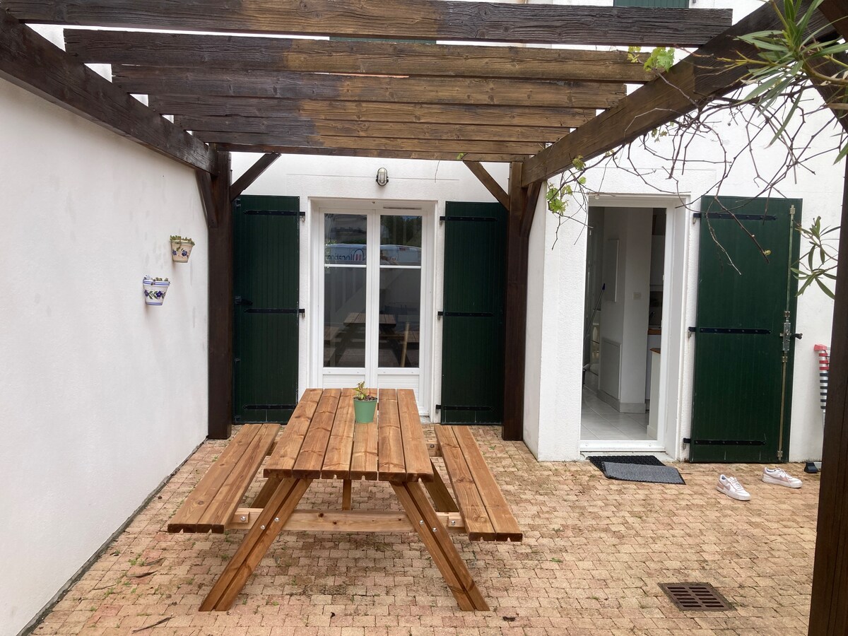 Maison de plain pied climatisée indépendante et jardin clos de murs, abri voiture et 2 terrasses Sud et Nord. Située à 300 m du Centre ville et à 80 m plage Sud Comprenant salon TV, pièce de vie, cuisine équipée four, lave-vais, frigos, plaque induc, micro-ondes, plancha, lave-linge 2 Ch indép : 1 avec 2 lits 90 l'autre 1 lit 140 linge fourni salle d'eau, WC indépendant QUARTIER du PARADIS très calme Proche de La Rochelle, Rochefort, îles de Ré, Oléron et Aix Location du samedi au samedi
