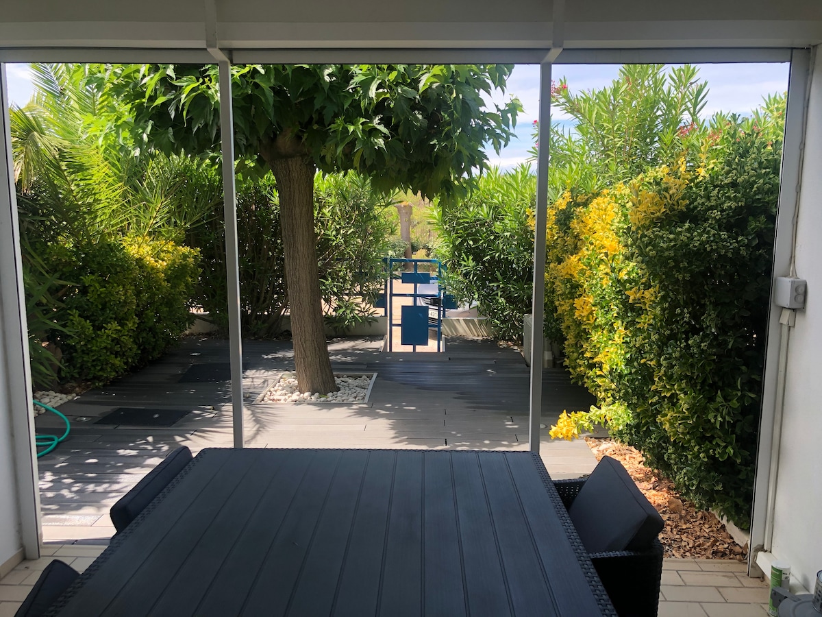 ☀️Relax in this quiet and elegant accommodation. ☀️In the heart of the marinas, pretty 20m2 studio and terrace with beautiful marina view, 3rd floor (no elevator). For 2 adults or 1 adult and 1 child ☀️It consists of a living room opening onto a beautiful terrace, air conditioning, a fully equipped kitchen, Nespresso, fridge, dishwasher, washing machine, electric oven, microwave... ☀️8 minutes walk from the beach and shops ☀️Private parking and free WIFI 🏊♂️POOL OPEN FROM May 15 to September 30