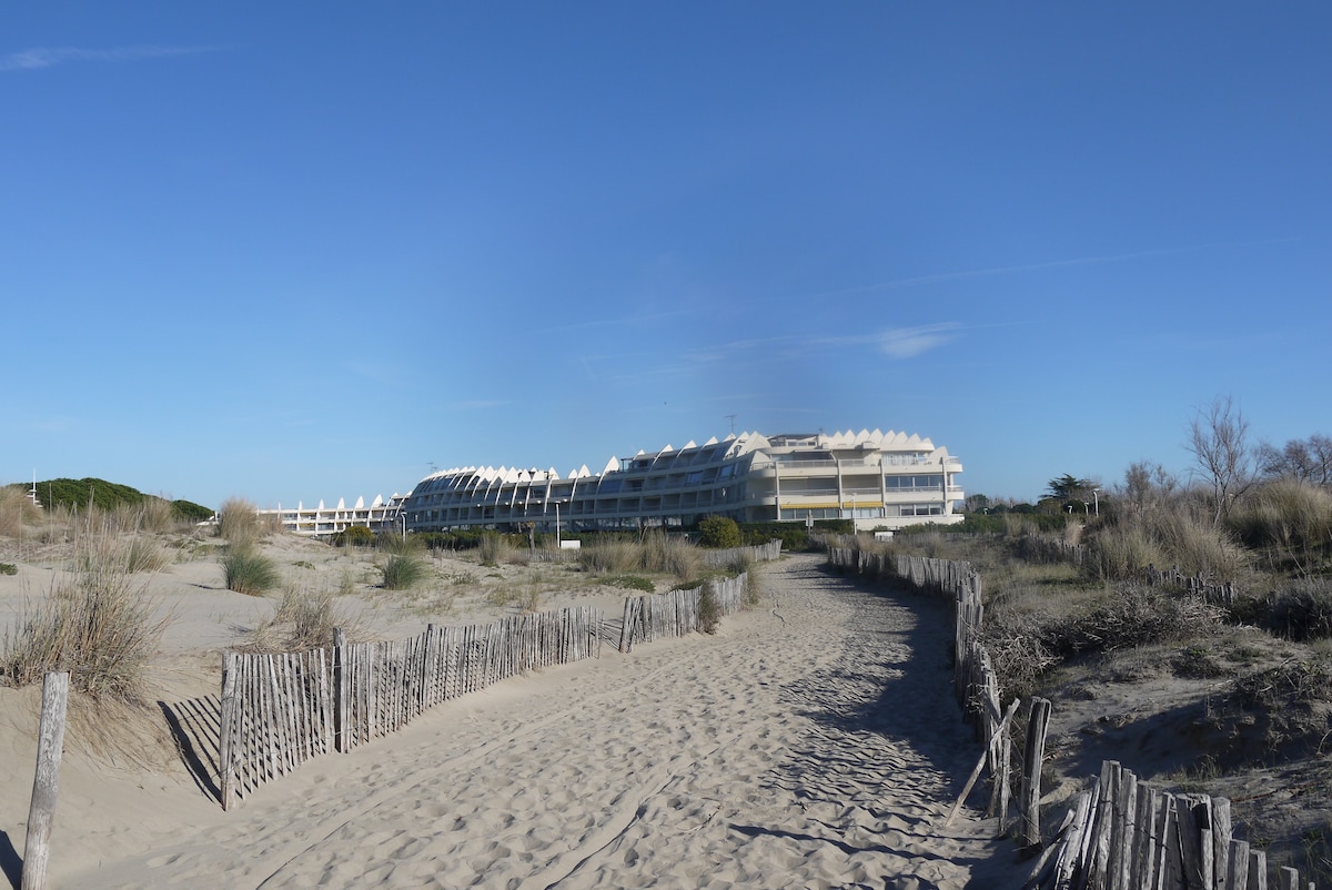 Idéal pour un séjour détente en couple ou entre amis à Port Camargue, 1er port de plaisance d'Europe ! Appartement de 30m2, refait à neuf pour vous offrir un séjour agréable dans un lieu moderne et fonctionnel. Au sein d’une résidence au calme, vous pourrez facilement profiter du centre du Grau du Roi, avec tous ses commerces et activités (20min à pied), ainsi que de la plage Nord (7min à pied) et de la plage de l'Espiguette (piste cyclable au départ de l'appartement-20min). Fêtes interdites.
