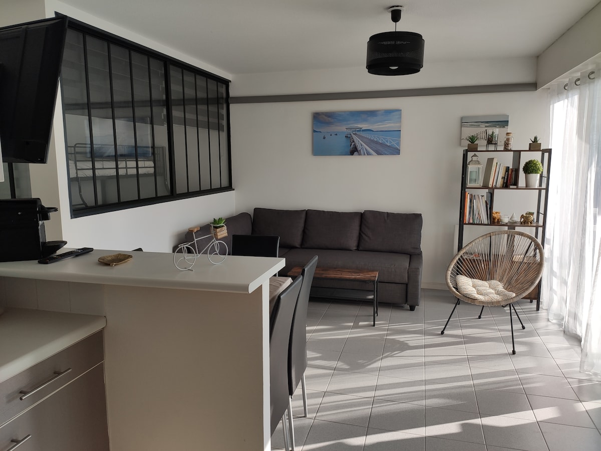 A quelques pas du centre-ville, entre plage et forêt, au 1er étage d'une petite copropriété : Grand studio "duplex", lumineux et refait à neuf, avec espace couchage à l'étage Vous pourrez profiter d'un espace extérieur aménagé (table-chaises de jardin) dans la cour de la copropriété 2 vélos adulte à disposition, (+ siège enfant vélo, lit parapluie, chaise bébé en prêt sur demande) pour des vacances réussies ! Au rdc: 1 canapé lit 140cm, à l'étage: 2 lits 80cm ou 1 lit 160cm