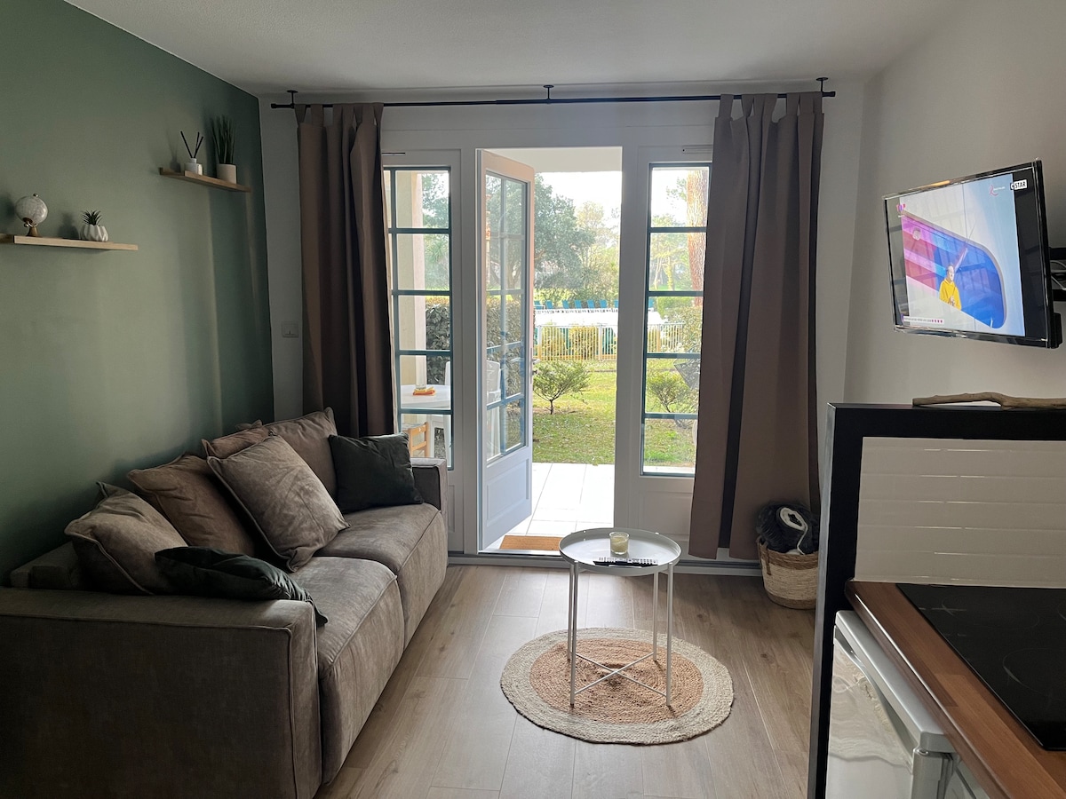 Joli appartement entièrement rénové au rez-de-chaussée d’une résidence avec piscine et parking. Il est composé d’une cuisine (plaques, réfrigérateur, lave-vaisselle, cafetière), un salon composé d’un lit d’appoint, une salle de bain, un coin couchage composé d’un lit superposé, d’une terrasse et d’un jardinet vue sur la piscine et le golf. Peut accueillir 4 personnes Lit d’appoint (2 couchages) Lit superposé (2 couchages) Commodités : 200m du golf 800m de la plage 300m des commerces
