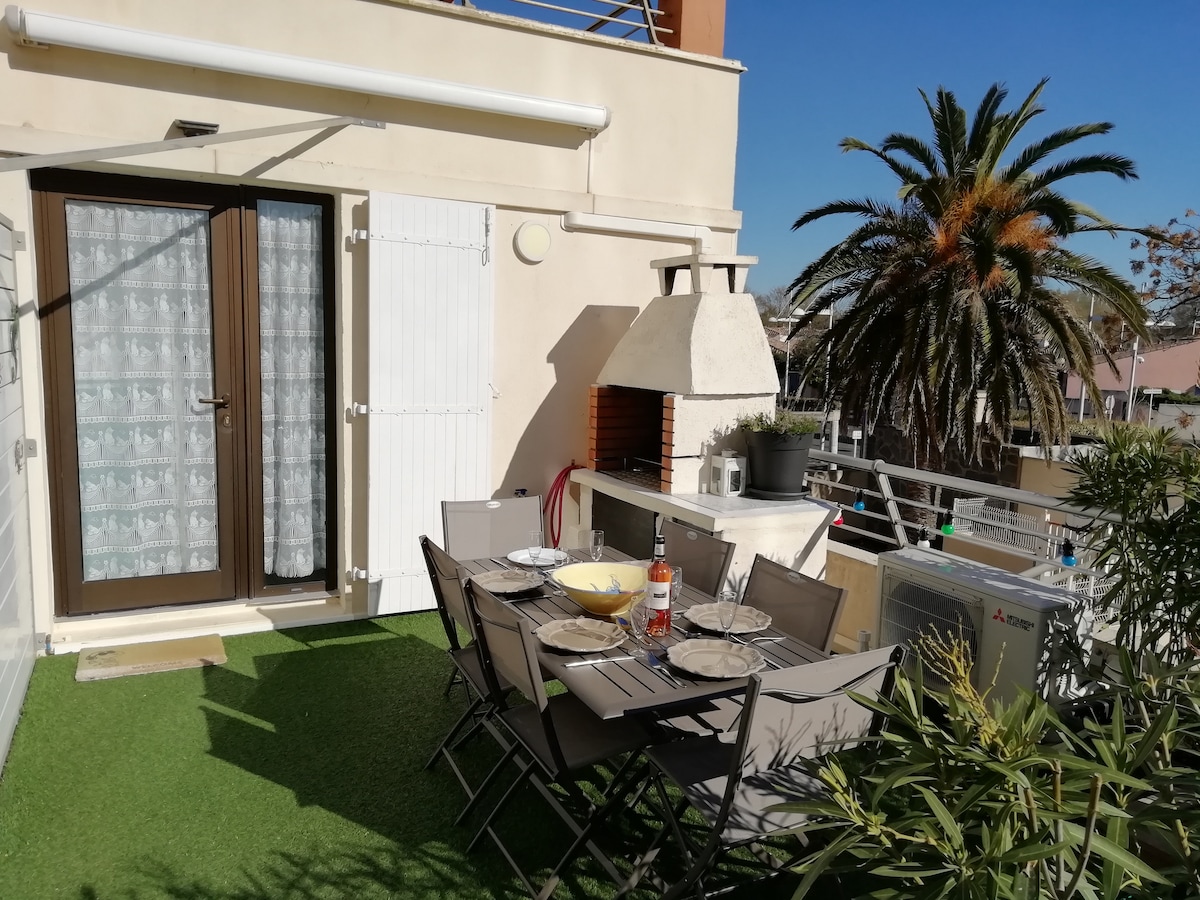 l.Embark on an ideal vacation in this charming, carefully renovated, bright apartment in the heart of the lively and popular district of Rochelongue. T2 38 m2 + 17m2 of private terrace in a small building with 3 apartments on the 1st floor, no neighbors above or below. Located 50 M. from the beach, shops restaurants seasonal entertainment on site. Market on Mondays in season. Ask the car and everything is done on foot or by bike (bike path at the foot of the apartment). A single watchword enjoy