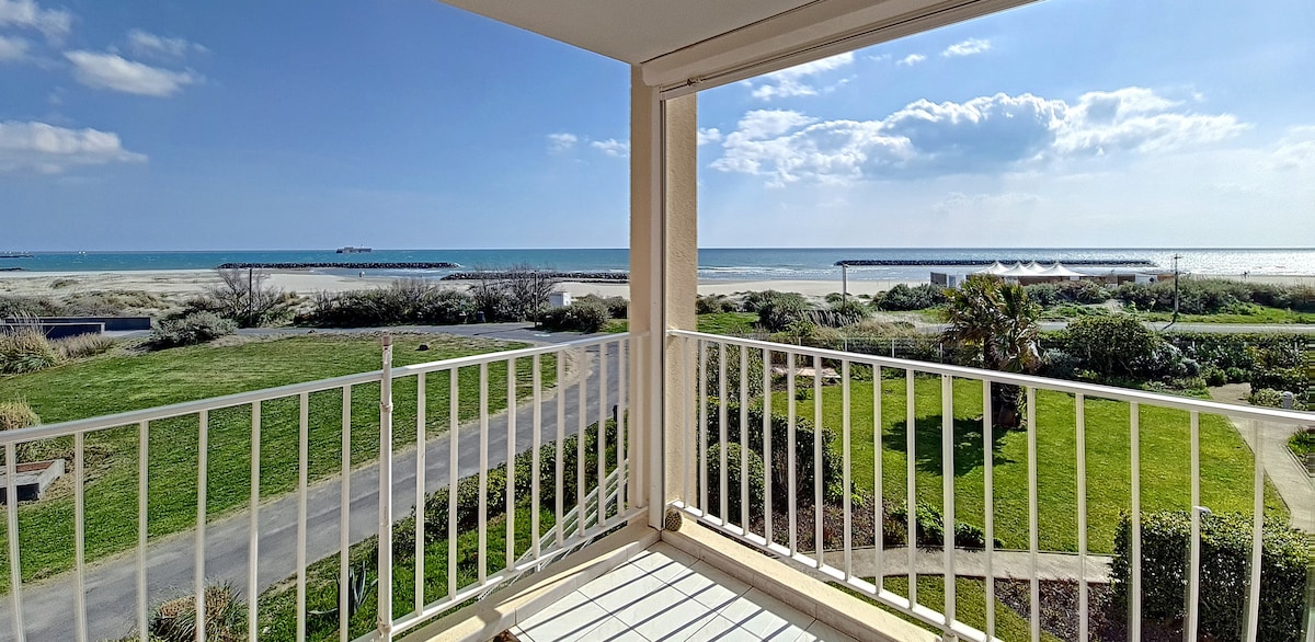 Profitez d'une superbe vue sur mer. Avec cette année une literie entièrement renouvelée Dans une superbe résidence de grand standing, appartement avec, depuis la terrasse, une vue panoramique sur la Méditerranée. La résidence se trouve sur la plage de Rochelongue, sans route à traverser pour la rejoindre et a deux pas des commerces du mail sans les inconvénients des bruits des commerces. A votre disposition un parking privé et, en été, une piscine dans la résidence. Location du samedi au samedi