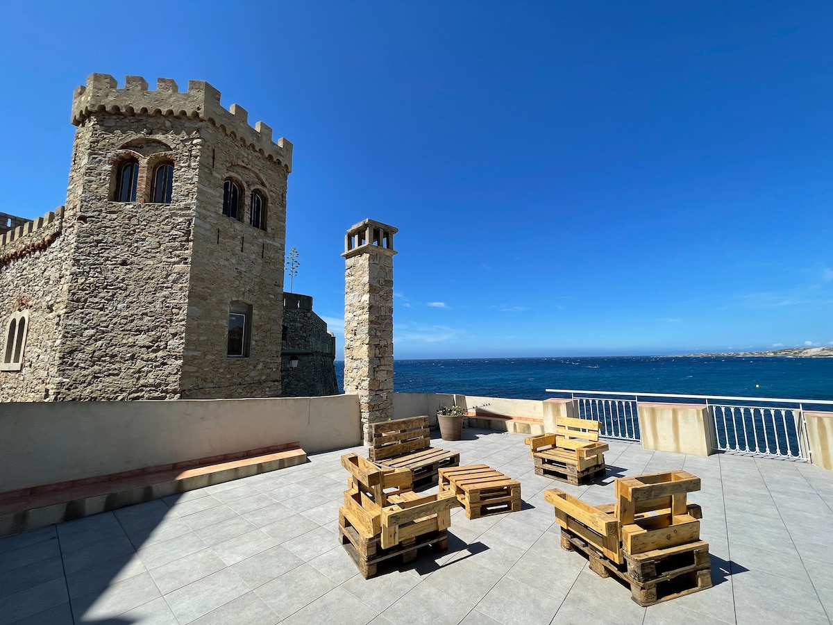两室公寓,带露台,可欣赏城堡和山脉的海景。