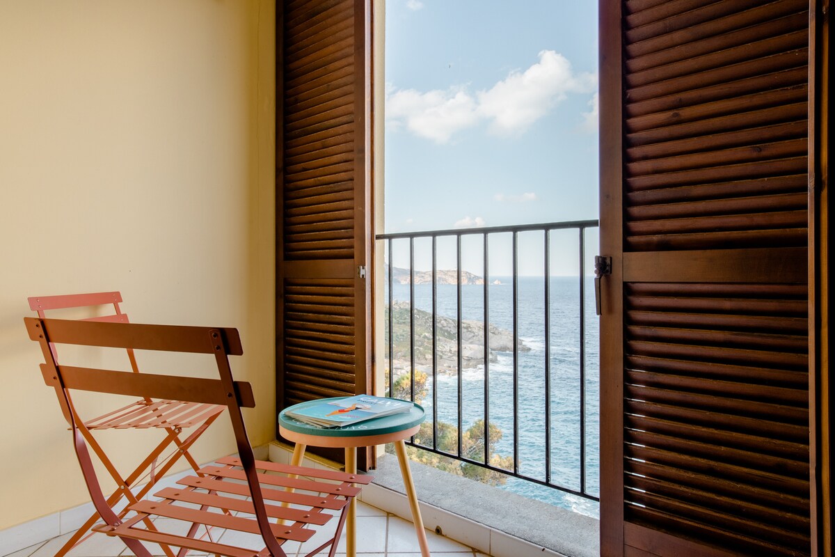 La mer à vos pieds ! Venez savourer des vacances paisibles dans cet appartement situé à moins de 100m à pied d'une crique. Au premier et dernier étage d'une petite résidence , venez profiter de la vue de la terrasse sur la mer et admirer ses couchers de soleil. Equipé de la climatisation, de la WIFI , et équipé à neuf, l'appartement dispose d'une grande chambre avec rangements et en mezzanine d'une chambre avec deux lits approchables. Ses atouts : Une vue magnifique et la proximité des plages.