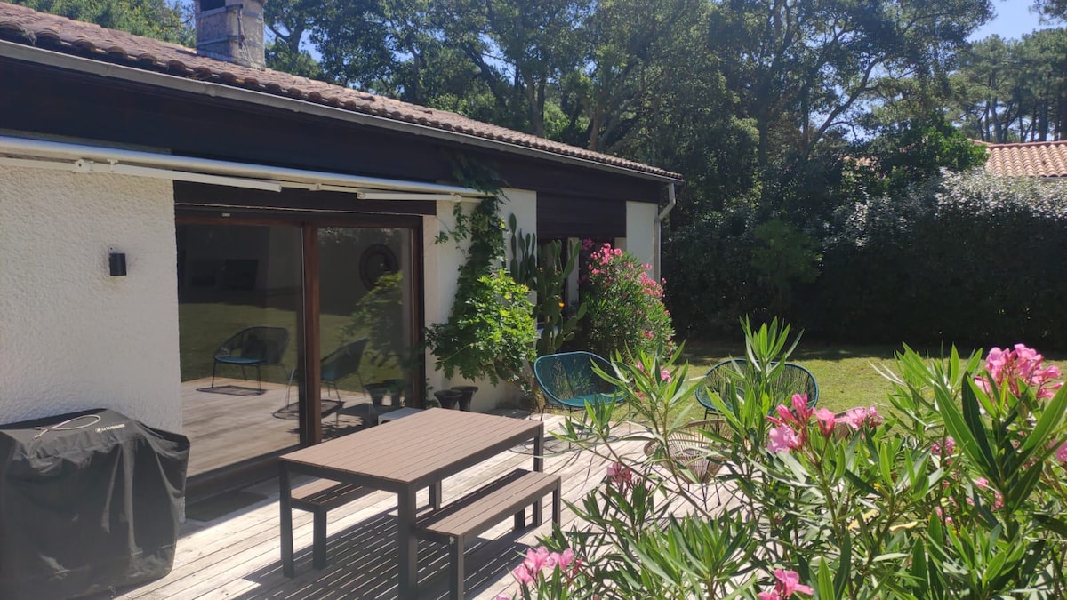 2 Bedroom House, sleeps 6, large garden, surrounded by Pine Forest. This is a lovely fully equipped, South facing house situated in Labenne Ocean, 500m from the Ocean. The open plan kitchen living room has South facing glass sliding doors, making the room very light and airy. The house was built with nothing but beautiful pine forest behind it. You can walk to the, surf spots, beach, local shops, bars, restaurants and takeaways.