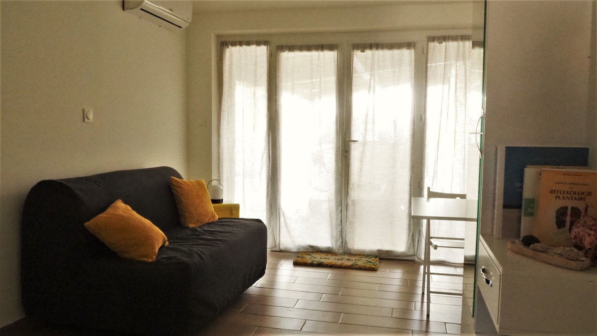 Studio de 20 m2 idéalement situé à 1 mn à pied de la station de métro baille, près des facultés de santé et du CHU Timone, à une station de la place Castellane et à 3 stations du métro Vieux Port. L'appartement se situe côté jardin ; il est donc très calme. La terrasse permet de déjeuner dehors Il est complètement équipé avec un canapé lit très confortable, de type clic-clac prévu pour un couchage quotidien en 140, couchage standard pour 2 personnes. Le linge de maison est fourni de même que le petit déjeuner et les produits de première nécessité. En cas de location longue le linge de maison est changé chaque semaine La cuisine comprend des plaques de cuisson, un réfrigérateur avec congélateur, un four micro-ondes, grille pain, machine à café nespresso. La salle de bains comprend un meuble lavabo, une douche (baignoire sabot) et des toilettes. Beaucoup de commerces et de restaurants à proximité, ainsi que le métro qui permet de rejoindre l'hypercentre en 2 minutes. Sur la place Castellane se croisent les deux lignes de métro, la ligne 3 du tramway et le départ des bus pour les Calanques ou les plages. Quelques jours avant votre arrivée, je vous communiquerai des conseils pour les transports afin de parvenir facilement jusqu'à l'appartement ainsi qu'une liste de bons plans pour les courses dans le quartier et les sorties sur Marseille ( visites, restaurants...)