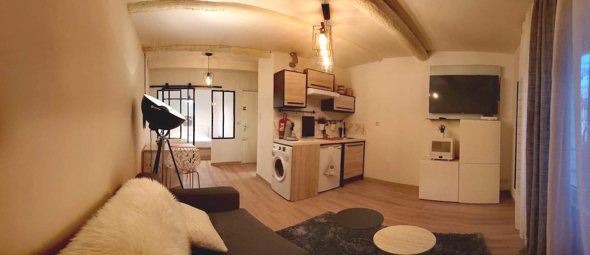 Charment T2, atypique et bien équipé, complétement refait à neuf. idéalement situé à quelques minutes à pied du Vieux Port, au cœur du Panier le quartier historique de Marseille, à deux pas du MUCEM, du Phare Saint Jean, de la célèbre place de Lenche, du centre de la vieille charité et de l'esplanade de la Majore. Bien desservi en transports, dans une impasse au calme, il sera parfait pour votre séjour à Marseille.