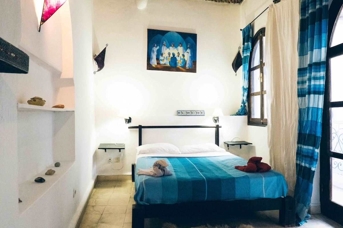 Dans un ancien Ryad restauré, très calme, alliant charme et poésie. Au premier étage, vous bénéficiez d'une vaste chambre élégament décorée et de sa salle de bain en Tadelakt, donnant sur le Patio. Sur le toit, une grande terrasse où à l'abri du vent et du soleil, berçé par le bruit des vagues et le ballet des mouettes, vous êtes dans la magie pure d'Essaouira... Vue sur l'Océan et la Médina !