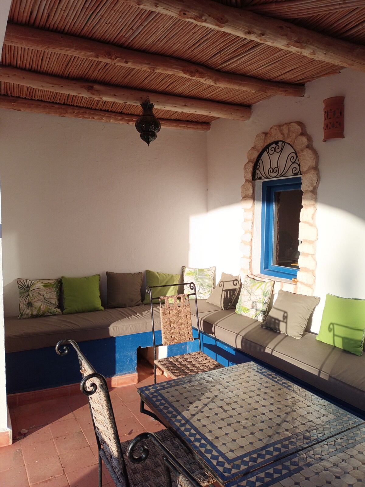 Dans un ancien Ryad restauré, très calme, alliant charme et poésie. Au premier étage, vous bénéficiez d'une vaste chambre élégament décorée et de sa salle de bain en Tadelakt, donnant sur le Patio. Sur le toit, une grande terrasse où à l'abri du vent et du soleil, berçé par le bruit des vagues et le ballet des mouettes, vous êtes dans la magie pure d'Essaouira... ! D'une des terrasses, vue sur l'océan et la Médina pour assister au coucher du soleil !