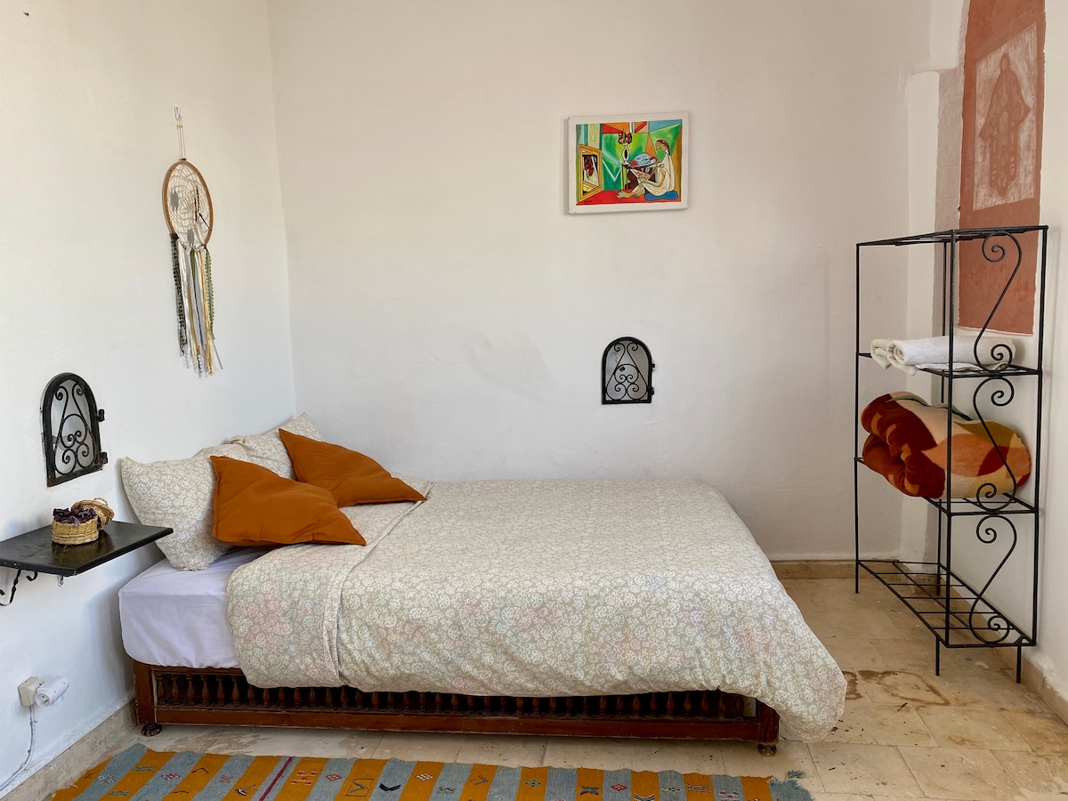The "Souiri" room, featuring a double bed, is bathed in natural light thanks to a large window overlooking a picturesque and quiet alleyway in the medina. Wi-Fi is available in the room. The shared bathroom (with shower) is located on the same floor. Breakfast is included and served on the terrace, facing the crashing waves of the ocean.