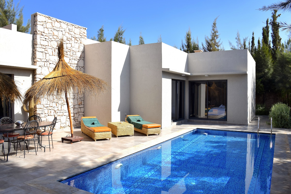 Dar Tikida Soleil is a bright, airy villa in Ghazoua—just 8 minutes from Essaouira, 10 minutes from Sidi Kaouki Beach, and 8 minutes from the airport. The property features 2 bedrooms, 2 bathrooms, a spacious living area, a private pool, and a terrace with open views of the surrounding countryside. Homemade breakfast and daily housekeeping are included. Perfect for couples, families, or remote workers looking for serenity.