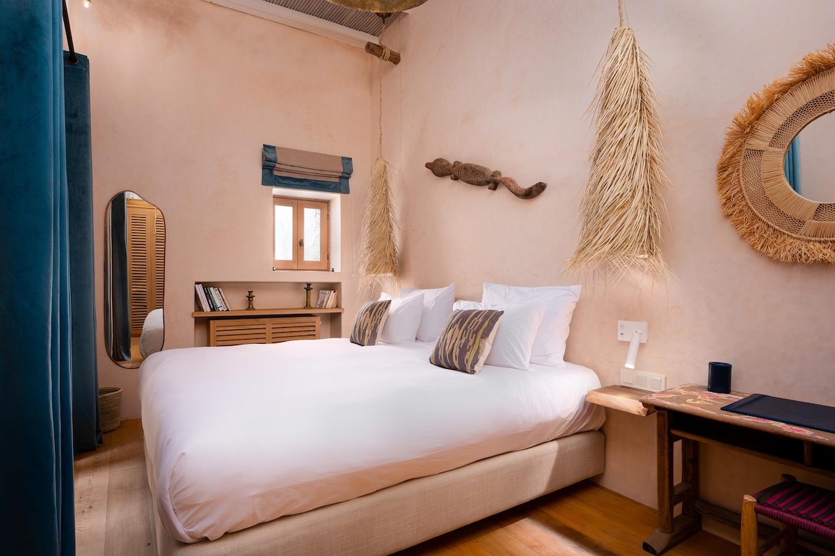 Découvrez le Duplex Mama 1, un refuge de charme à Essaouira. Alliant modernité et authenticité marocaine, chaque détail est pensé pour votre confort. Le rez-de-chaussée offre un espace bureau, une salle de bain avec matériaux nobles, et un lit simple donnant sur le patio. À l’étage, une chambre cosy avec lit double de palace et une alcôve pour bébé. Profitez des peignoirs, produits naturels, et d'un petit-déjeuner gourmand sur la terrasse. Une expérience unique vous attend à Mama Lova.